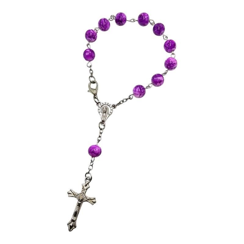 Elegancka dziesiątka różańca wykonana z pięknych, fioletowych szklanych koralików o średnicy 8 mm, imitujących naturalny kamień. Ta stylowa dziesiątka jest zapinana, co umożliwia jej wygodne noszenie lub zawieszenie, na przykład w samochodzie. Łącznikiem różańca jest delikatna postać Maryi, a całość zwieńczona jest ozdobnym,metalowym krzyżem o wymiarach 32x17 mm. To subtelne i pełne duchowego znaczenia akcesorium, idealne do codziennej modlitwy i jako wyraz wiary.