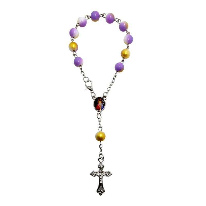 Elegancka i głęboko symboliczna zapinana dziesiątka różańca, idealna do noszenia na co dzień lub do modlitwy w podróży. Różaniec wykonany jest na trwałym łańcuszku, co gwarantuje jego wytrzymałość. Charakteryzuje się wyjątkowymi, złoto-fioletowymi koralikami (o perłowym lub żywicznym połysku), które nadają mu szlachetnego wyglądu. To doskonały wybór dla osób czczących kult Jezusa Miłosiernego.