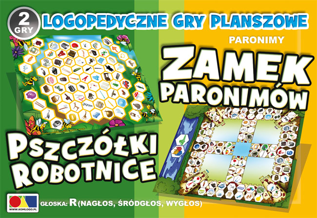 Zamek Paronimów paronimyGra przeznaczona do ćwiczeń słuchu fonemowego. Grać może od 2 do 4 dzieci. Rozpoczyna gracz, który wyrzucił 6 oczek. Przesuwa się on do przodu o tyle pól ile uzyskał w rzucie kostką, dodatkowo wymawiając poprawnie paronimy na mijanych polach. Wygrywa osoba, która pierwsza dotrze pionkami do swojego domku. Napotkanego na danym polu rywala można wyrzucić, wówczas jest on zmuszony do rozpoczęcia gry swoim pionkiem od nowa. W grze można wykorzystać od 1 do 3 pionków.Pszczółki Robotnice r (nagłos, śródgłos, wygłos)Gra przeznaczona jest do ćwiczeń głoski r (nagłos, śródgłos, wygłos). Grać może od 2 do 4 graczy. Gra polega na przejściu pionkiem (pionkami) po plastrze miodu. Start następuje z pierwszych czterech pól plastra miodu leżących po przeciwnej stronie wybranego przez gracza domku (domki to cztery wydzielone pola z obramowaniem w kolorze czerwonym, żółtym, niebieskim i zielonym). W grze można wykorzystać od 1 do 4 pionków. Grę rozpoczyna gracz, który wyrzuci kostką 6 oczek. Wówczas ustawia się on na dowolnym polu po przeciwnej stronie (przekątnej) domku. Następnie rzucając kostką przesuwa się o liczbę pól, które wskazuje kostka. Przesuwając pionek gracz musi nazwać napotkane po drodze obrazki. W przypadku wyrzucenia 6 oczek, graczowi przysługuje dodatkowy rzut kostką. Jeżeli pionek gracza zatrzyma się na polu, gdzie stoi pionek przeciwnika, następuje jego strącenie do punktu startu. Ruch pionka może odbywać się do przodu, w linii prostej lub po przekątnej. Wygrywa gracz, który pierwszy ustawi swoje pionki w domku.