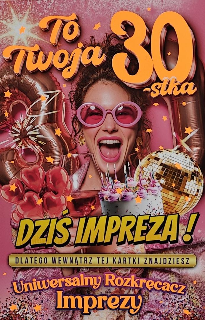 Zmiana kodu na trójkę z przodu wymaga odpowiedniej oprawy! Szukasz prezentu, który od razu wprawi Solenizantkę w szampański nastrój? Ta śmieszna kartka na 30. urodziny dla kobiety to absolutny hit. Utrzymana w energetycznym, różowym klimacie, z motywem tortu, kuli disco, balonów i radosnym hasłem "To Twoja 30-stka. Dziś Impreza!", idealnie sprawdzi się jako upominek dla przyjaciółki, siostry, żony czy koleżanki, która jest gotowa na świętowanie do białego rana.