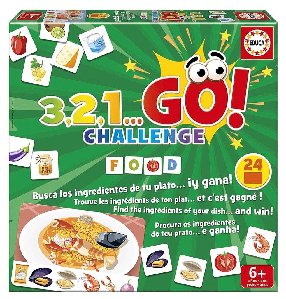 3, 2, 1 Start! to seria szybkich gier dla dzieci. Gra Wyzwanie: Jedzenie ma trzy warianty, każdy z nich opiera się na spostrzegawczości i dobrej koncentracji graczy. Pierwszy z nich to Potrawy na stół. W tym wariancie każdy gracz ma jedną kartę przedstawiającą danie. Elementy wszystkich układanek są pomieszane i znajdują się na środku stołu. Na komendę "3, 2, 1... Start!" wszyscy odkrywają karty i zaczynają szukać składników swojej potrawy. Kiedy gracz, jako pierwszy, zgromadzi wszystkie składniki - wygrywa rundę. Gracze otrzymują nowe dania na kolejną rundę. Gra się w ten sposób aż jeden gracz nie zbierze pięciu potraw, to on wygrywa. Drugi wariant to Szwedzki stół. Ten wariant przebiega tak jak Potrawy na stół, z tą różnicą że gracz po znalezieniu składników pierwszego dania, dobiera nową kartę z potrawą. Gra kończy się kiedy na stole nie ma składnika z któregoś dania. Osoba, która skompletowała najwięcej potraw - wygrywa. Trzeci wariant to Z karty menu. W tym wariancie karty dań dzieli się na przystawki, dania główne i desery. Najpierw wszyscy gracze zbierają składniki dobranej przystawki, kiedy tylko to zrobią dobierają kartę dania głównego i szybko szukają jego składników, kiedy danie główne jest gotowe, dobierają kartę deseru. Po pełnym skończonym posiłku, znowu wracają do kart przystawek i tak dopóki nie można dobrać karty z któregoś ze stosów. Każdy gracz liczy ile potraw udało mu się zrobić, dodatkowo dolicza po jednym punkcie za każdy pełny zestaw. Osoba, która ma najwięcej punktów - wygrywa. ZAWARTOŚĆ: 24 dania 150 składników instrukcja.
