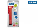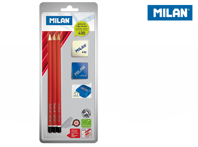 Ołówki sześciokątne MILAN HB z systemem zabezpieczającym grafit przed złamaniem. Idealne do pisania i rysowania. Temperówka kwadratowa AFILA z bezpiecznym i wytrzymałym ostrzem ze stali węglowej. Doskonała do ołówków i kredek. Idealna do piórnika. Gumka MILAN 430: miękka gumka syntetyczna do ścierania większości rodzajów grafitu z każdego rodzaju papieru.