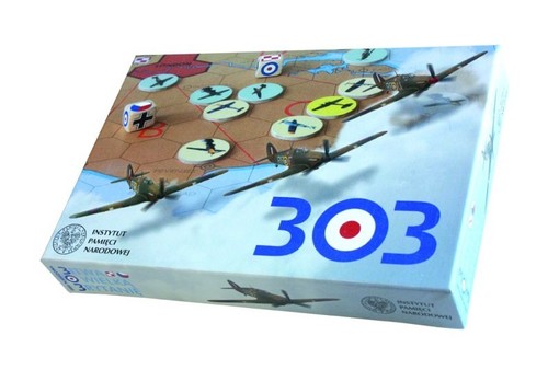 „303” jest szybką wojenną grą planszową dla dwóch osób. Jeden z graczy dowodzi RAF broniącym Wielkiej Brytanii, a drugi atakuje niemieckim Luftwaffe. Zadaniem lotnictwa Trzeciej Rzeszy jest zbombardowanie Londynu, a celem lotnictwa alianckiego powstrzymanie agresora. Każdy z graczy dysponuje sześcioma różnymi samolotami za pomocą których prowadzi operację wojenną na planszy, nawiązującej do stołu dowodzenia RAF. Podniebne pojedynki rozstrzygane są przy użyciu specjalnie zaprojektowanych kości. Zawartość: - plansza rozgrywki wzorowana na stole sztabowym - 12 dwustronnych żetonów z samolotami - 3 kości strzału - 1 wskaźnik zużycia paliwa - 12 znaczników strzału - instrukcja Liczba graczy: 2. Wiek: 10+ Czas gry: 15 min.