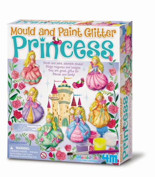 "4M Art & Craft ODLEWY GIPSOWE – BROKATOWE KSIĘŻNICZKI Formuj i maluj gipsowe magnesy na lodówkę lub broszki z brokatem w kształcie 6 uroczych księżniczek. Zawartość: · proszek gipsowy, · foremka do odlania 6 księżniczek, · farby, · pędzelek, · magnesy, · wpinki Wymiary opakowania: 18 x 22 x 5,5 cm Produkt przeznaczony dla dzieci powyżej 5. roku życia "