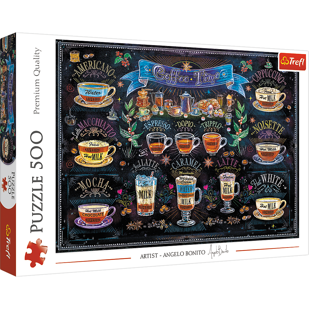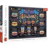 Puzzle składające się z 500 elementów przedstawiające rysunkowy kolaż ze smakowitymi kawami. Po ułożeniu powstanie obrazek o wymiarach 580 x 340 mm.