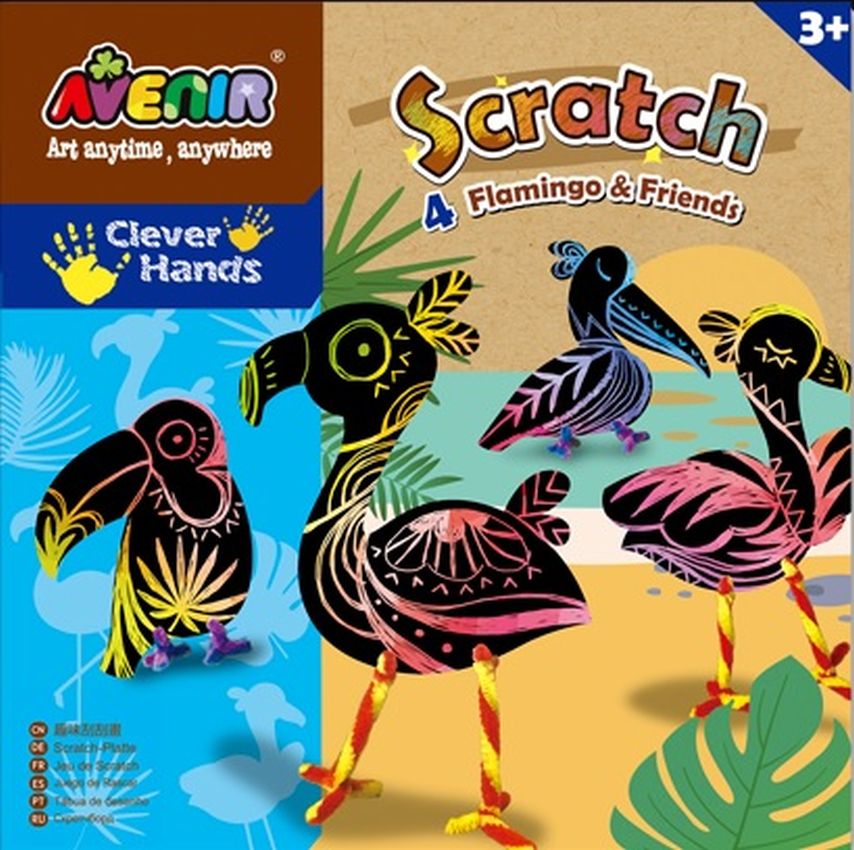 Avenir Scratch to zupełnie nowe podejście do prac ręcznych. Wyjątkowy arkusz, na którym tworzy się poprzez zdrapywanie warstwy wierzchniej, by odsłonić wielobarwną warstwę spodnią. Zabawka kreatywna najwyższych lotów, pozwalająca nie tylko tworzyć piękne prace, ale także dająca doświadczenia sensoryczne - dzięki użyciu odpowiedniego narzędzia i zachowywania się papieru podczas zabawy dziecko odbiera nowe wrażenia dotykowe. W zestawie są 4 formaty oraz patyczek do zdrapywania. Dla dzieci powyżej 3. roku życia. Opakowanie: 23 x 23 cm.