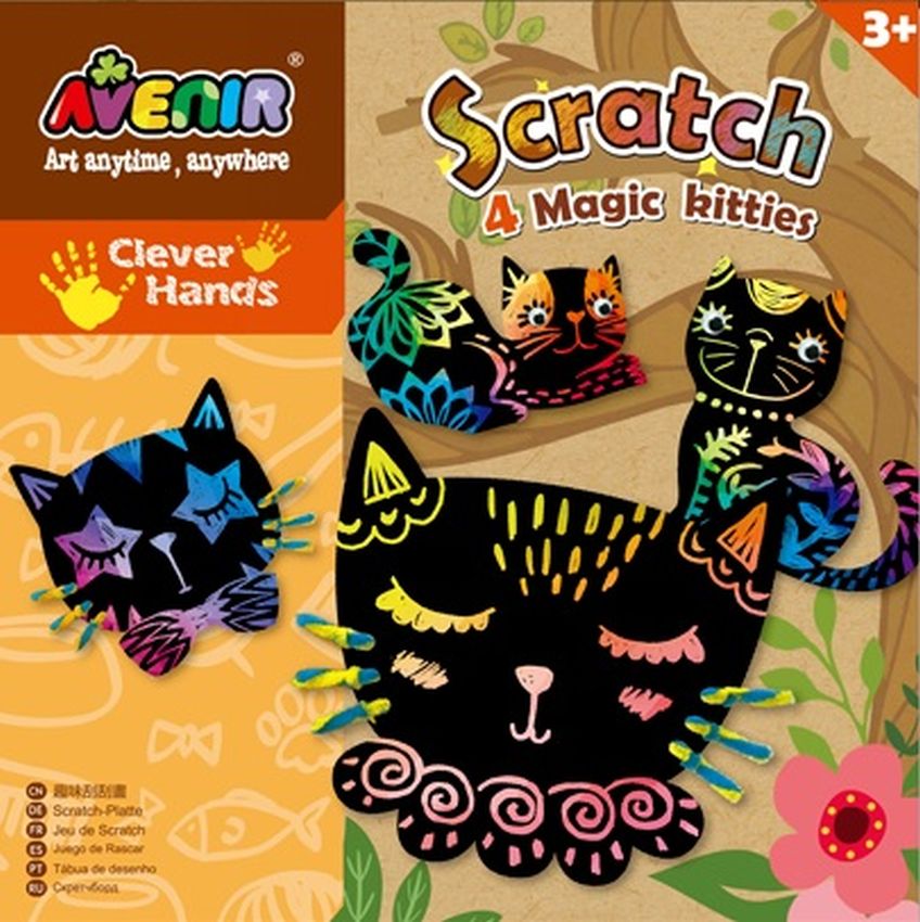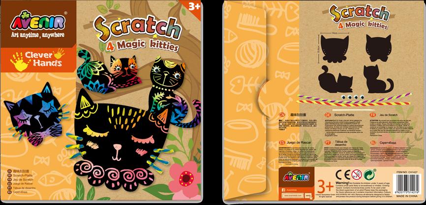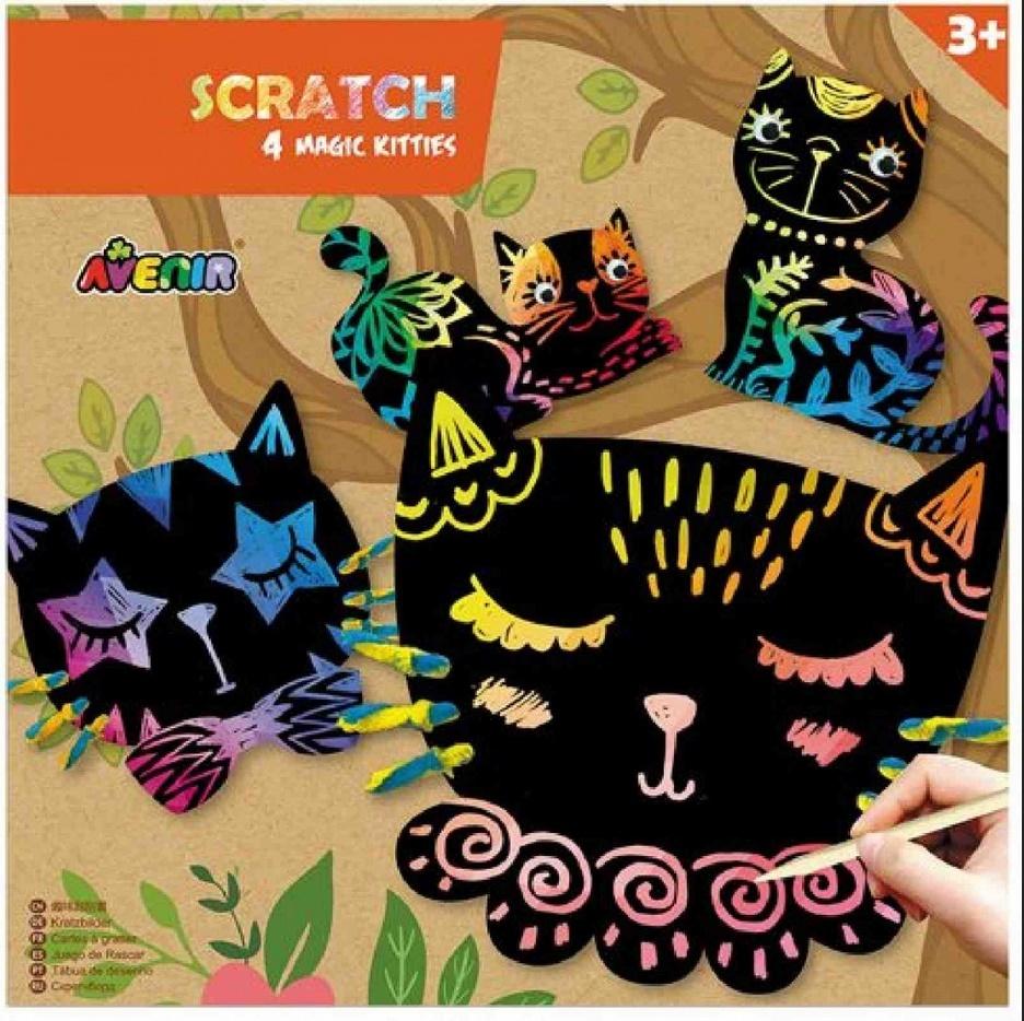 Avenir Scratch to zupełnie nowe podejście do prac ręcznych. Wyjątkowy arkusz, na którym tworzy się poprzez zdrapywanie warstwy wierzchniej, by odsłonić wielobarwną warstwę spodnią. Zabawka kreatywna najwyższych lotów, pozwalająca nie tylko tworzyć piękne prace, ale także dająca doświadczenia sensoryczne - dzięki użyciu odpowiedniego narzędzia i zachowywania się papieru podczas zabawy dziecko odbiera nowe wrażenia dotykowe. W zestawie są 4 koty oraz patyczek do zdrapywania. Dla dzieci powyżej 3. roku życia. Opakowanie: 23 x 23 cm.