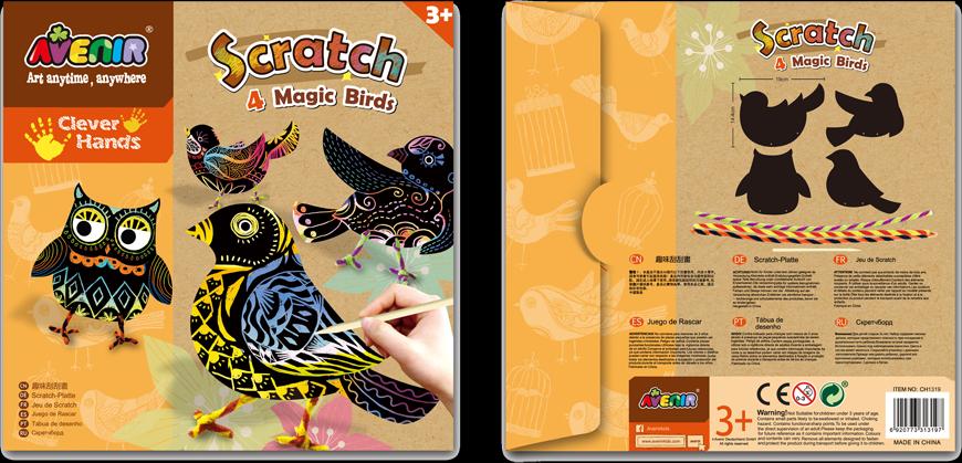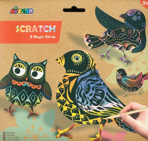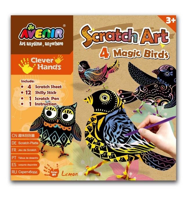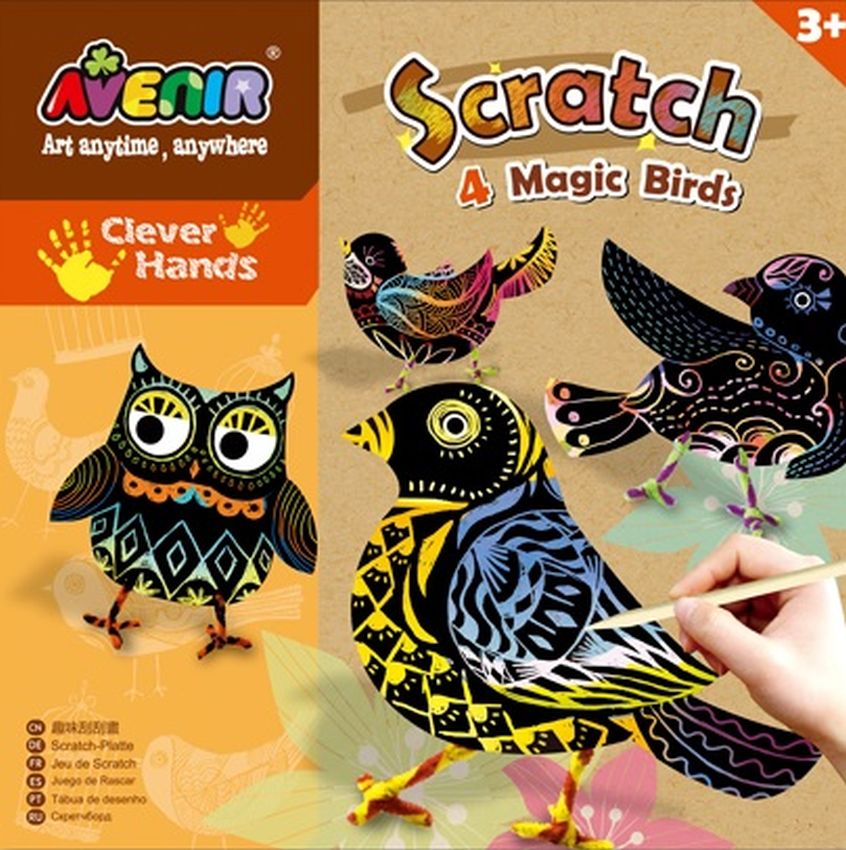 Avenir Scratch to zupełnie nowe podejście do prac ręcznych. Wyjątkowy arkusz, na którym tworzy się poprzez zdrapywanie warstwy wierzchniej, by odsłonić wielobarwną warstwę spodnią. Zabawka kreatywna najwyższych lotów, pozwalająca nie tylko tworzyć piękne prace, ale także dająca doświadczenia sensoryczne - dzięki użyciu odpowiedniego narzędzia i zachowywania się papieru podczas zabawy dziecko odbiera nowe wrażenia dotykowe. W zestawie są 4 magiczne ptaki oraz patyczek do zdrapywania. Dla dzieci powyżej 3. roku życia. Opakowanie: 23 x 23 cm.