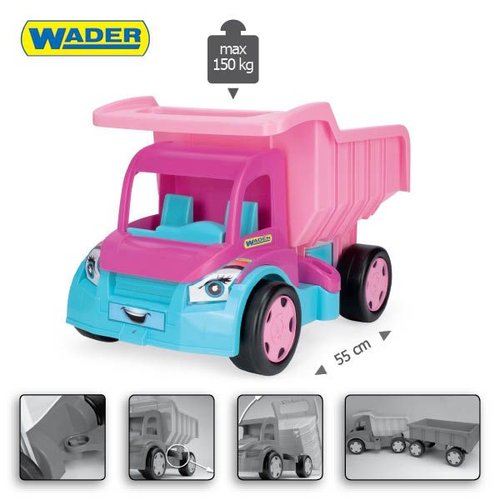 Gigant Truck Wywrotka to okazały samochód o długości 55 cm i ogromnej nośności do 150 kg. Wywrotka posiada otwierany kiper oraz wygodny uchwyt. Auto charakteryzuje się nowoczesnym wyglądem, zaokrąglonymi krawędziami i bogatą kolorystyką. Zestaw doskonale nadaje się zarówno do zabawy w domu, jak i w ogrodzie, czy piaskownicy i jest idealny dla dzieci w wieku 2-5 lat. Największą zaletą zabawki jest solidność konstrukcji, dzięki której samochód służy zabawie latami.