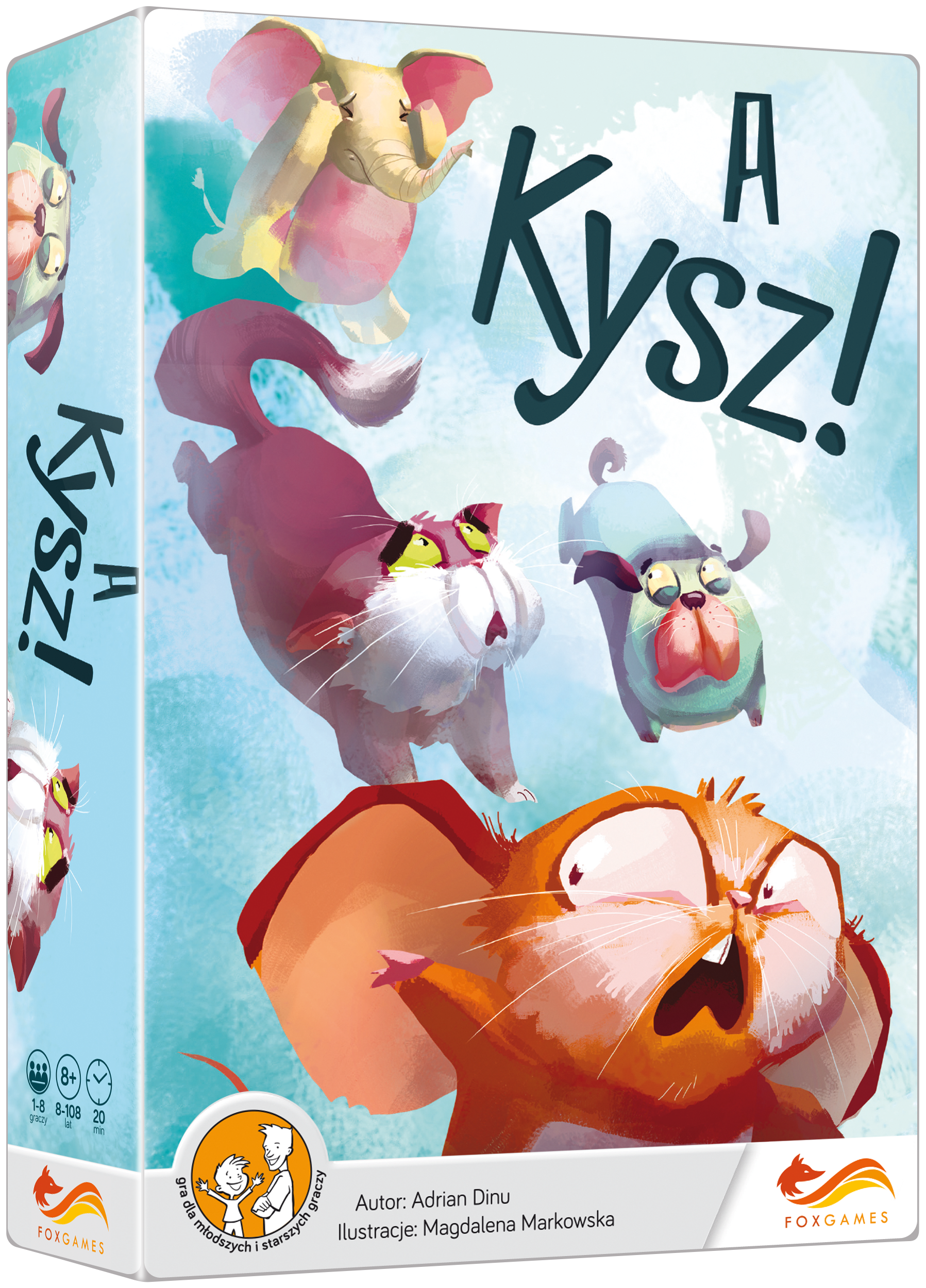 A kysz! to urocza gra karciana dla młodszych i starszych, której uczestnicy będą starali się przestraszyć jak najwięcej zwierzaków należących do przeciwników. Słoń boi się myszy, mysz - kota, kot ucieka przed psem, a pies - przed słoniem. Zwycieży osoba, która najlepiej poradzi sobie z tą niecodzienną układanką. Jak grać? Gracz w sekrecie dowiaduje się, które zwierzę i kolor stada należy do niego. W swoim ruchu przekłada jednego zwierzaka tak, aby przestraszył on innego. Wygrywa gracz, który na końcu gry będzie miał na stole jak najliczniejsze stado Celem gry jest zdobycie jak największej liczby punktów. Gracze otrzymują je za każde zwierzę, które na koniec gry pozostanie na stole i będzie pasowało do kart sekretnych celów danego gracza. Co sprawi, że grę pokochają dzieci? prześliczne ilustracje prosta mechanika, którą można opanować dosłownie w 3 minuty, duże pole do kombinowania można zabrać ją wszędzie!