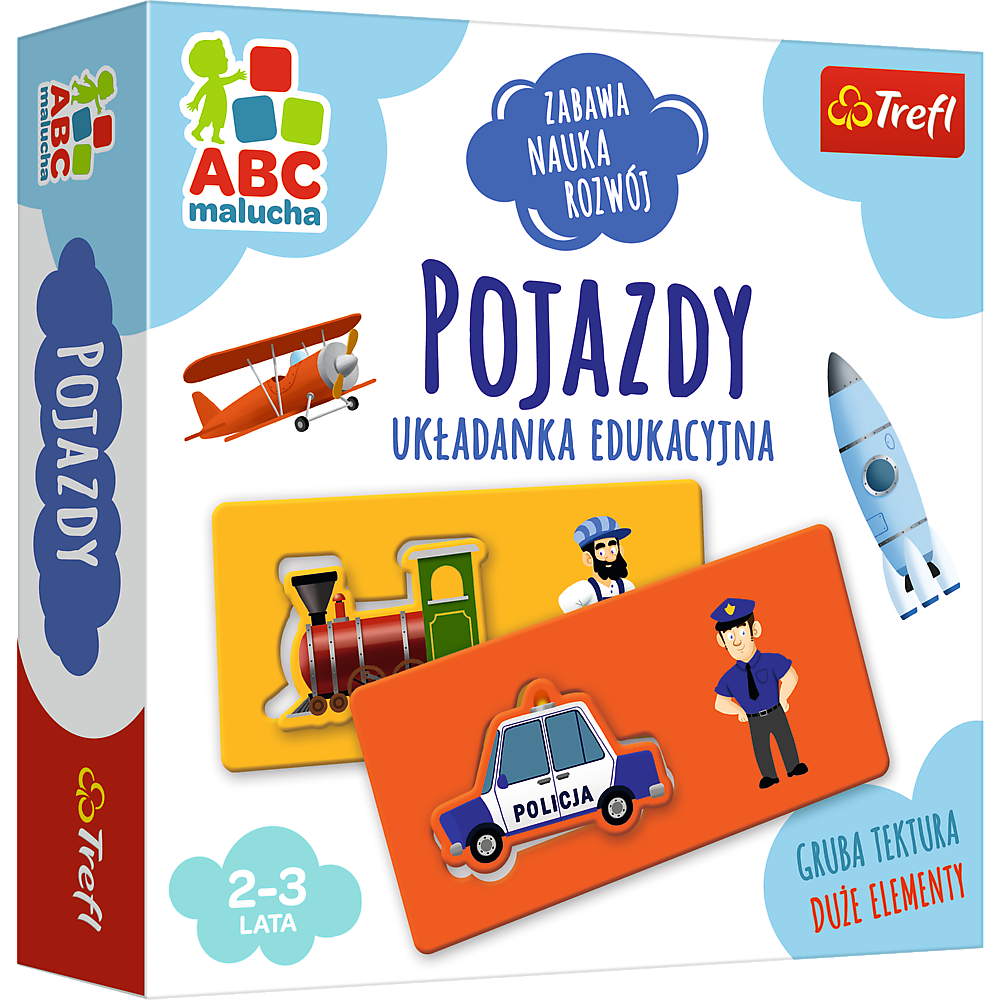Pojazdy to układanka edukacyjna stworzona z myślą o najmłodszych. Podczas radosnej zabawy uczą się nazw różnych środków transportu, ich właściwości oraz nazw osób, które je prowadzą. Dla dzieci w wieku 2-3 lat