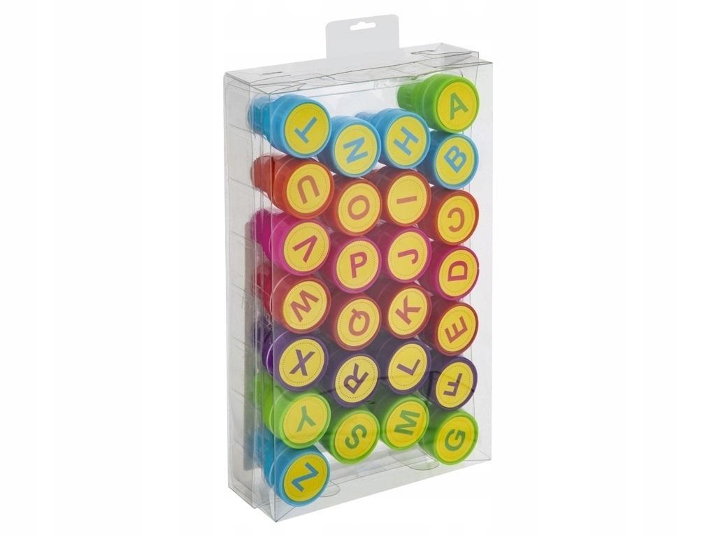 W zestawie znajduje się 26 literek stempelków. Podzielone są na 6 kolorów (niebieski, pomarańczowy, różowy, fioletowy, zielony i czerwony). Z pewnością sprawdzą się przy nauce pisania i czytania.