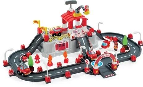 remiza strażacka z akcesoriami do zbudowania mini miasta. Po skończonej zabawie klocki można schować w skrzynce. Górna część skrzynki służy jako podstawa do zbudowania remizy. Wyprodukowane we Francji. 18 m+