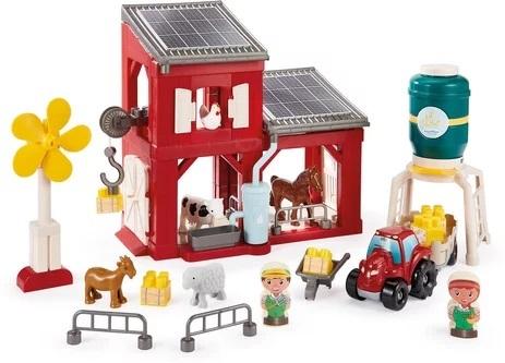 Duża ekologiczna farma z panelami słonecznymi i turbiną wiatrową. Gospodarstwo obejmuje również parę rolników, traktor z przyczepą oraz silos zbożowy. Wyprodukowane we Francji. 18 m+