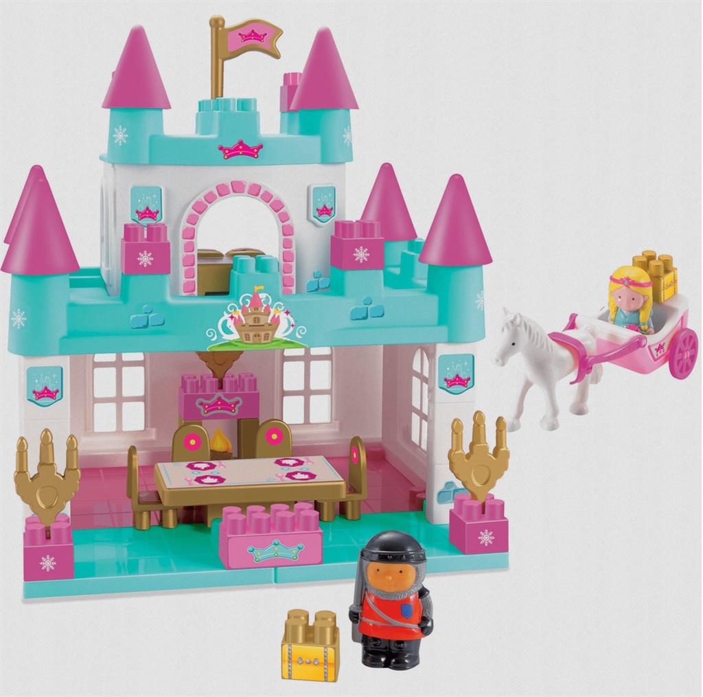 Piętrowy, pastelowy pałac, na parterze komnata ze stołem, krzesłami i kominkiem. Na piętrze znajdziemy sypialnię księżniczki. W zestawie z zamkiem nie może zabraknąć księżniczki w karocy oraz pilnującego jej rycerza.