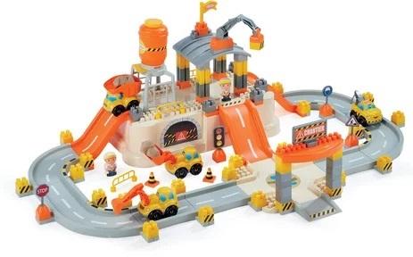 Plac budowy z akcesoriami do zbudowania mini miasta. Po skończonej zabawie klocki można schować w skrzynce. Górna część skrzynki służy jako podstawa do zbudowania placu budowy. Wyprodukowane we Francji. 18 m+