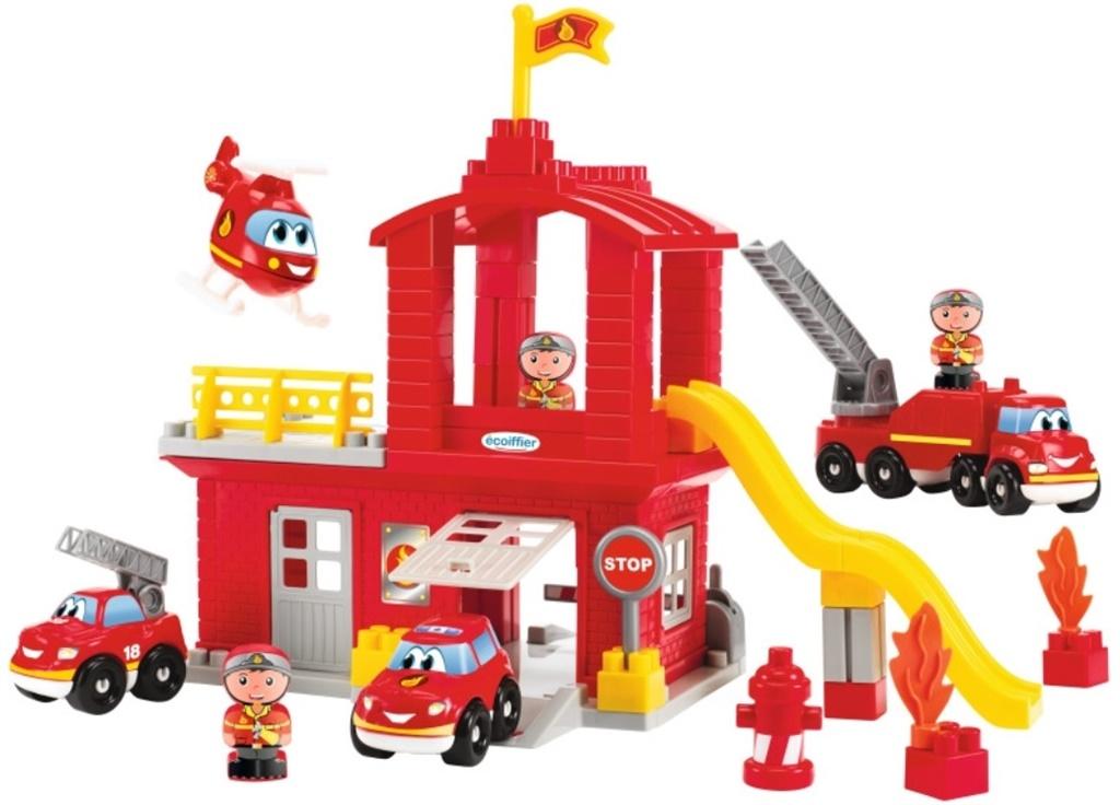 Piętrowa remiza strażacka z tarasem i zjeżdżalnią, drzwiami garażowymi i szlabanem. Znajdziemy tu 3 samochody strażackie, helikopter i 3 figurki strażaków oraz wiele dodatków, takich jak hydrant, płomienie,klocki.