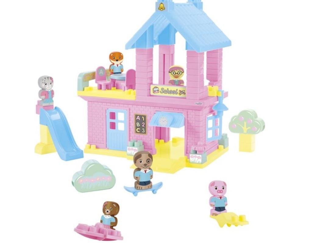 Piętrowa, pastelowa szkoła z mnóstwem miejsca do zabawy, w tym zjeżdżalnia karuzela, huśtawka, taras ze stolikiem i krzesełkami. Zestaw zawiera 6 figurek, Wymiary: 33,5x30x35,5 cm, 18m+