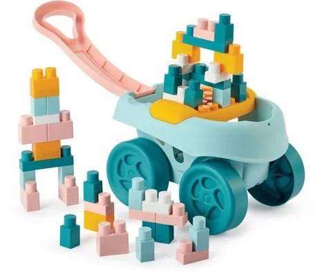wózek na 4 kółkach z rączką do łatwego prowadzenia. W zestawie 40 klocków oraz podstawka do układania klocków. Wyprodukowane we Francji. 12 m+