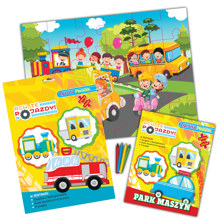 Znajdziemy w zestawie książkę pełną zabaw, łamigłówek i zadań, kolorowe kredki z ulubionymi postaciami oraz dwustronne puzzle. Jeden z elementów układanki można pokolorować według własnego pomysłu.