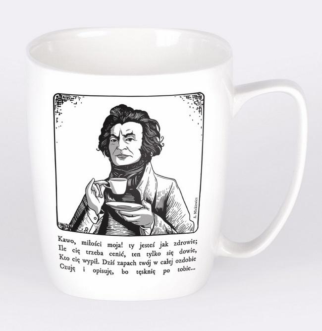 Brak energii mnie dręczy… Kawo, miłości moja! ty jesteś jak zdrowie; Ile cię trzeba cenić, ten tylko się dowie, Kto cię wypił. Dziś zapach twój w całej ozdobie Czuję i opisuję, bo tęsknię po tobie… Takiej kawy jak w Polszcze nie ma w żadnym kraju, toteż należy pić ją w doborowym towarzystwie i w wyjątkowej oprawie! Czym dla kawy jest dobra śmietana, tym w trudny poranek w pracy jest obecność na biurku Adama Mickiewicza, który o nic nie pyta, a wszystko rozumie… Kubek ADAM MICKIEWICZ z wizerunkiem najwybitniejszego polskiego wieszcza poleca się na prezent dla romantyka, polonisty, fana twórczości Mickiewicza i każdego literata. Niech nigdy nie zabraknie im weny, energii i motywacji! Kubek z porcelany Pojemność: 380 ml Pojemność użytkowa: 360 ml Zapakowany w szykowny kartonik Idealny prezent na każdą okazję Nadruk po dwóch stronach kubka, logo na spodzie Można myć w zmywarce