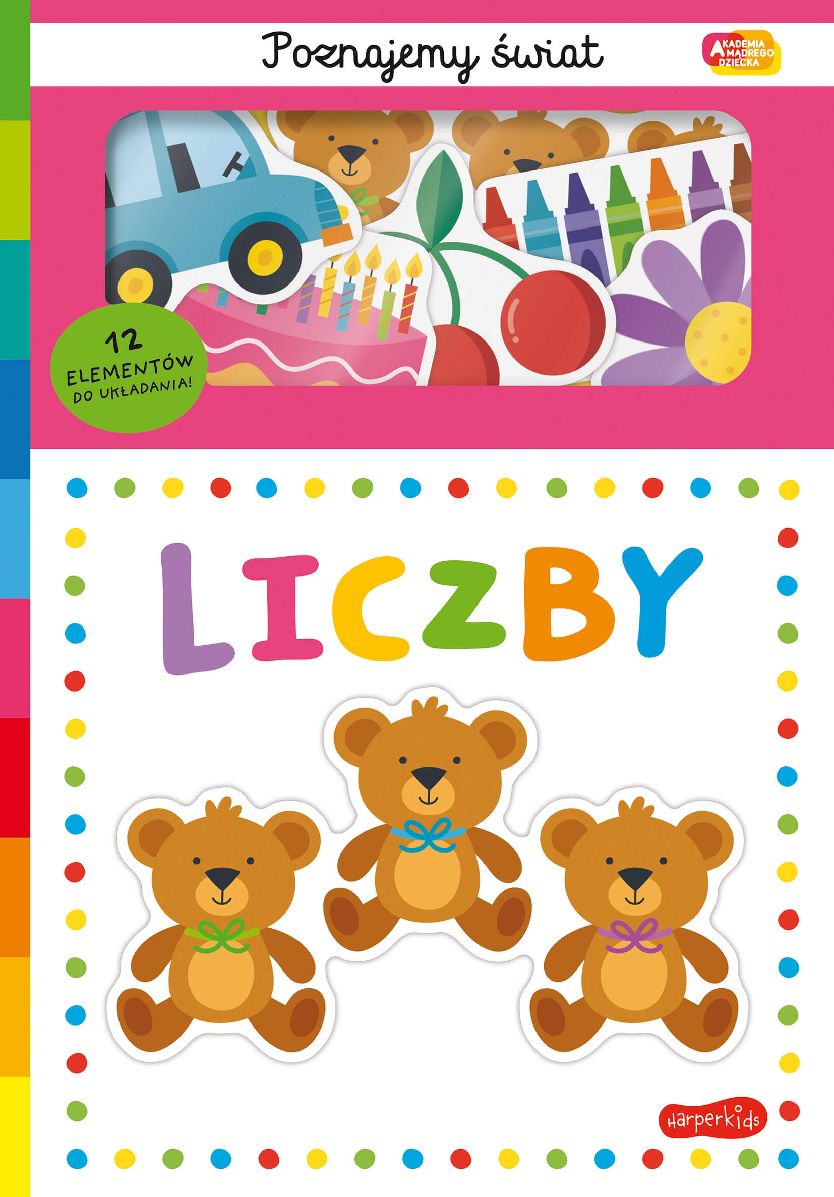 Zapraszamy do zapoznania się z nowością w serii Poznajemy Świat. Akademii Mądrego Dziecka pod tytułem Liczby. Każda strona książeczki zaprasza do zabawy i nauki cyferek. Przejedź paluszkiem po pustych miejscach na stronie i zobacz, jak wygląda dana liczba. Znajdź odpowiedni puzzel, dopasuj i włóż w puste miejsce. Następnie pokaż na paluszkach cyferkę. A może masz w swoich zabawkach autko, pluszowe misie czy kredki. Policz z rodzicem swoje zabawki!