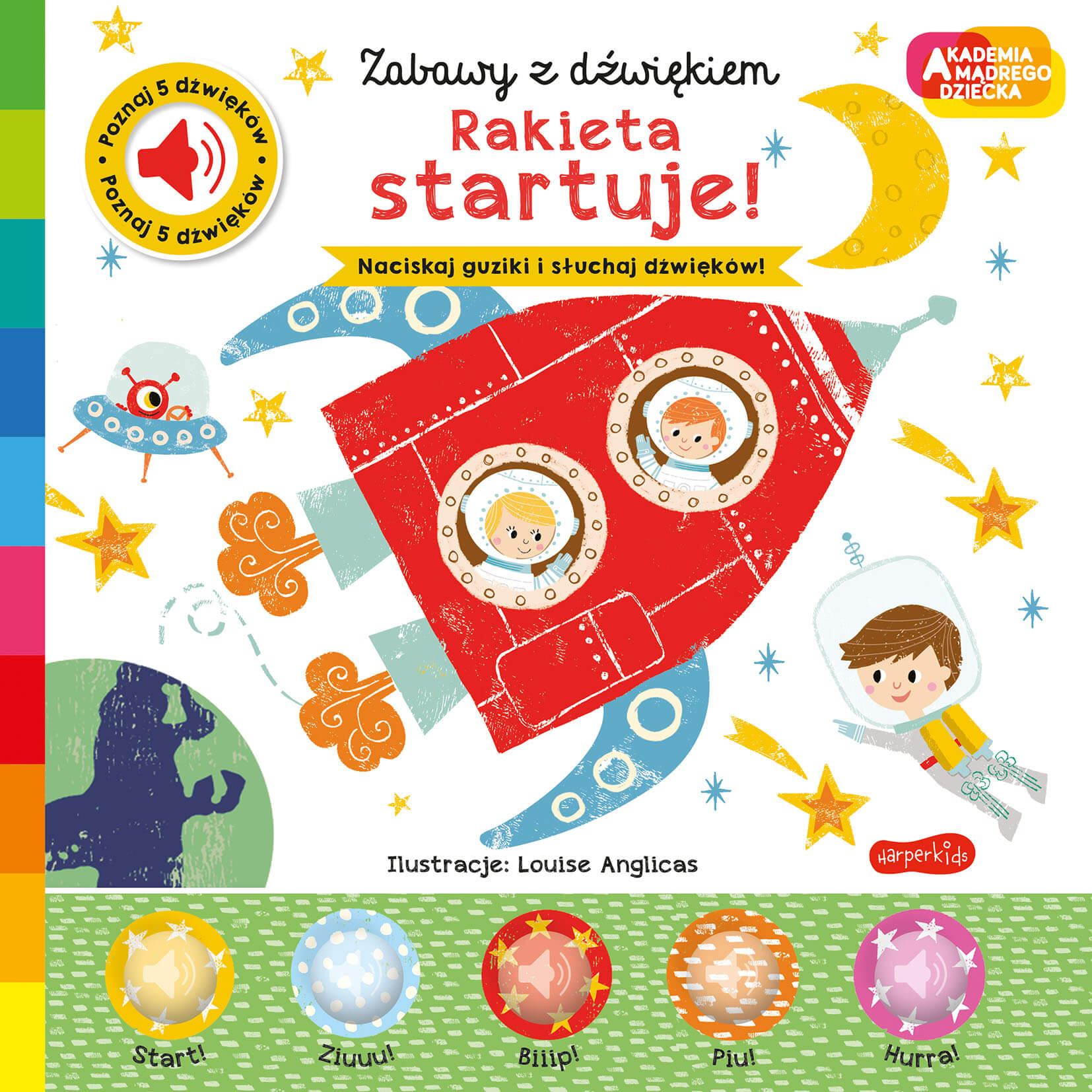 Akademia Mądrego Dziecka to znana i lubiana seria dla najmłodszych. Nowością wydawniczą są książeczki dźwiękowe Zabawy z dźwiękiem, do których należy tytuł Rakieta startuje! Książeczka opowiada o grupie astronautów, która wybiera się w kosmos. Na pierwszej stronie widzimy jak z w centrum kontroli lotów trwa odliczanie przed startem rakiety. Następnie obserwujemy jak astronauci przelatują pomiędzy planetami w kierunku księżyca. Mijają spadające gwiazdy, a nawet statek z ufoludkami! Czy uda im się dolecieć na księżyc? Koniecznie sprawdź kolejne strony! Pamiętaj o naciskaniu kolorowych guziczków na każdej stronie. Dzięki nim usłyszysz odpowiedni dźwięk dedykowany każdej stronie. Naciskając guziczki nasz młody czytelnik ćwiczy paluszki oraz aparat mowy naśladując usłyszany dźwięk. Dodatkowo ćwiczy skupienie słuchając krótkiego opowiadania. Nasi czytelnicy polecają też inne tytuły w serii: Cisza!, Przyjęcie u piratów! oraz Leniwcu, pospiesz się!