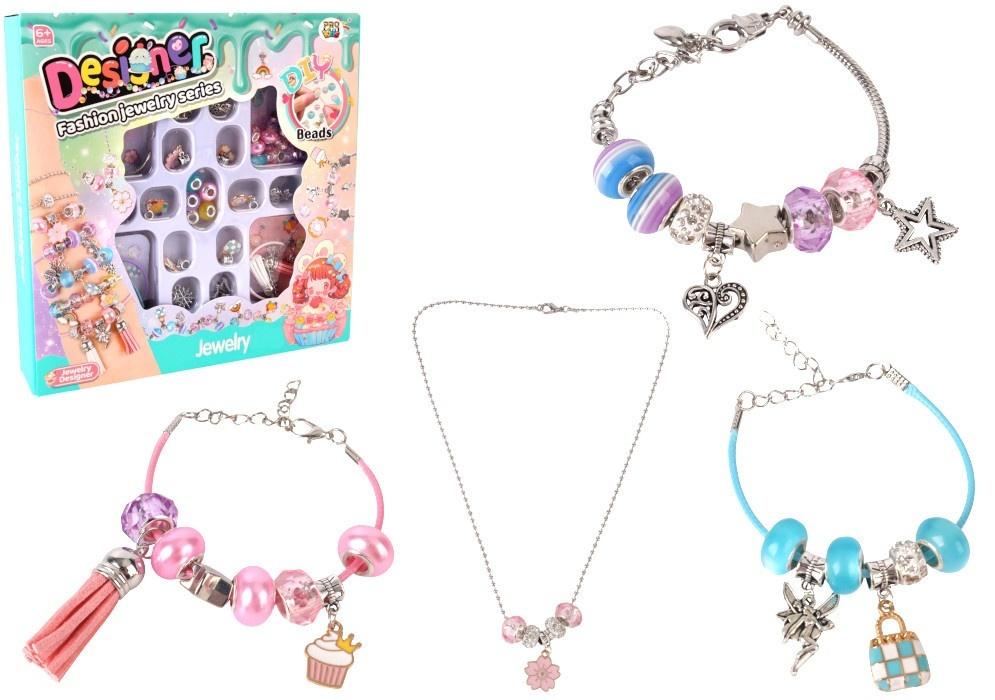 Każdy element został starannie wykonany i zachwyca różnorodnością kształtów oraz kolorów. Wśród ozdób znajdują się motywy serduszek, gwiazdek, kwiatów, torebek, wróżek i babeczek, dzięki czemu dziecko może tworzyć biżuterię dopasowaną do swojego stylu. Całość umieszczono w estetycznym pudełku z przegródkami, które ułatwia porządkowanie i przechowywanie drobnych części.