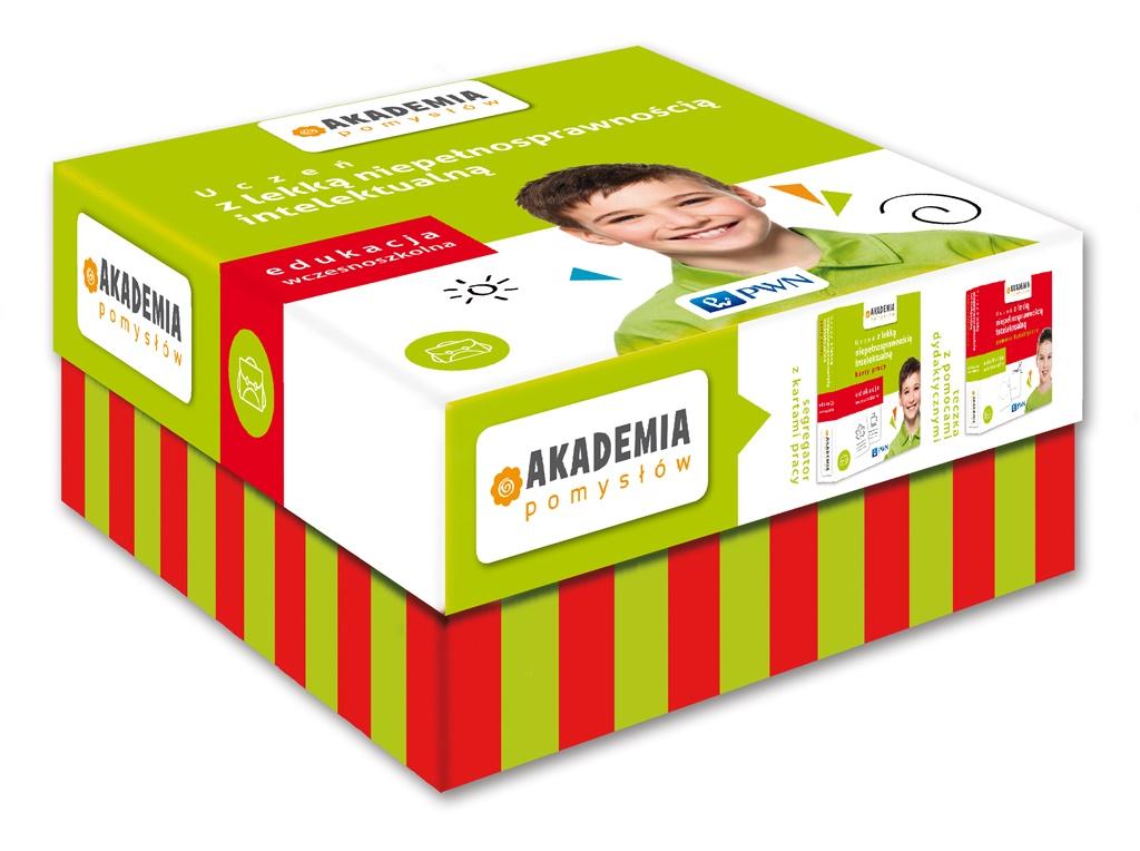 Akademia pomysłów. Uczeń z lekką niepełnosprawnością intelektualną to obszerny zbiór materiałów dostosowanych do możliwości psychofizycznych uczniów z niepełnosprawnością intelektualną w stopniu lekkim pomagający w opanowaniu materiału z zakresu podstawy programowej edukacji wczesnoszkolnej. Zawartość pakietu: • Segregator zawierający 660 różnorodnych kart pracy służących rozwijaniu umiejętności szkolnych, myślenia, pamięci, koncentracji, spostrzegawczości, grafomotoryki i sensoryki. Zawartość segregatora jest podzielona na trzy części, zawierające odpowiednio treści: - polonistyczne, - matematyczne - społeczno-przyrodnicze. W segregatorze znajdują się również plansze do edukacji społeczno-przyrodniczej. • Pomoce dydaktyczne, czyli zestaw 20 pomocy wspierających edukację dzieci, pomagających w codziennym funkcjonowaniu w szkole, pozwalających lepiej utrwalić zdobywane wiadomości i umiejętności. Zalety pakietu: materiały dostosowane do możliwości psychofizycznych uczniów z niepełnosprawnością intelektualną w stopniu lekkim – pod względem: formy, języka, ilości materiału i sposobu pokazania treści na stronie połączenie nauki z zabawą pomaga uczniom łatwiej opanować treści, z których przyswojeniem mają problem kompleksowa publikacja dla placówki: jedna publikacja dla wszystkich nauczycieli wspomagających/pedagogów specjalnych. Proponowane materiały mogą być wykorzystane: w szkołach masowych, w szkołach integracyjnych w szkołach specjalnych na zajęciach: edukacyjnych, rewalidacyjnych, zarówno indywidualnych, jaki i grupowych. Materiały również mogą być wykorzystywane w pracy z uczniami z niepełnosprawnością intelektualną w stopniu umiarkowanym.