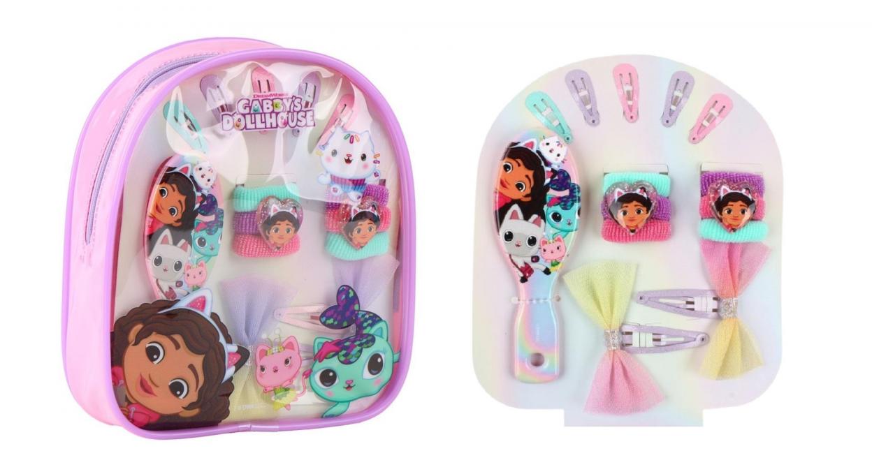 Licencjonowany zestaw akcesoriów do włosów - Koci Domek Gabi to urocza propozycja dla małych fanek tej popularnej bajki. Całość zapakowana jest w estetyczny, mały plecaczek prezentowy, który zachwyca wyglądem i może być później wykorzystywany do przechowywania drobiazgów. Przezroczysty front pozwala od razu zobaczyć zawartość zestawu, dodając mu atrakcyjności.
