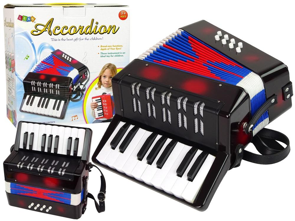 Akordeon Instrument Muzyczny Dla Dzieci Muzyka Czarny Muzyczny akordeon to fantastyczna zabawka dla dzieci lubiących muzykę i wesołą zabawę. Muzyka relaksuje i wprawia w dobry nastrój! Instrument wygląda jak prawdziwy i brzmi bardzo dobrze. Doskonale rozwija zdolności motoryczne oraz słuch dziecka a przy tym idealnie przygotuje dziecko do gry na prawdziwym instrumencie. Zasada działania akordeonu jest taka sama jak w prawdziwym instrumencie, aby wydobyć dźwięk, trzeba rozwijać i składać harmonijkę, akordeon posiada przyciski basowe i dźwiękowe oraz uchwyt na ręce. Przy odrobinie ćwiczeń akordeon zacznie wydawać wspaniałe dźwięki. Instrument posiada 17 klawiszy (C-E) oraz 8 przycisków basowych, paski do naciągania mieszka oraz do zapięcia instrumentów. Dodatkowe paski pozwolą na zawieszenie akordeonu na ramiona. Wymiary akordeonu: 24 cm x 12 cm x 23 cm Wymiary opakowania: 25 cm x 25 cm x 13 cm Zabawka przeznaczona jest dla dzieci powyżej 3 roku życia. Akordeon zapakowany w kolorowe pudełko idealnie nadaje się na prezent.