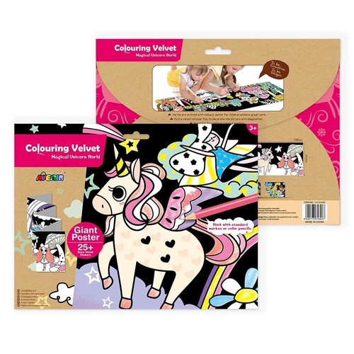 Stwórz niesamowity aksamitny plakat i naklejki z jednorożcem. Aksamitna kolorowanka jest cudowna w dotyku i ma przepiękne, nasycone kolory. W połączeniu z bajeczną grafiką, kolorowanka zapewni Twojemu dziecku zupełnie nowe wrażenia. Do zabawy wystarczą standardowe kredki i markery. 6 wzorów sprawi, że zarówno chłopcy jak i dziewczynki znajdą motyw, który im się spodoba. W zestawie: - aksamitny plakat do pokolorowania (126 x 29 cm) - zestaw aksamitnych naklejek do pokolorowania Wiek: 3+