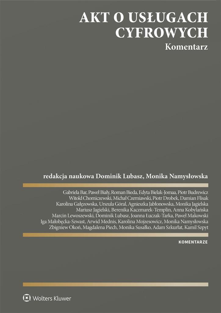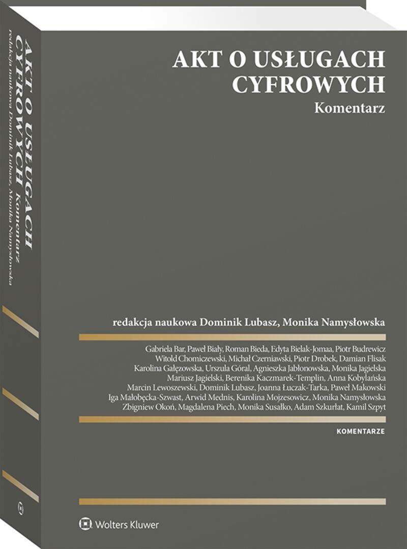 Komentarz zawiera najbardziej kompleksowe na rynku opracowanie i wyjaśnienie regulacji aktu o usługach cyfrowych, ze wskazaniem kierunków wykładni, ułatwiających wdrożenie przepisów przez podmioty zobowiązane, przed wszystkim oferujących usługi pośrednie online, jak i stosowanie zarówno przez komercyjnych użytkowników usług cyfrowych, jak i organy nadzorcze. Opracowanie w sposób szczegółowy omawia nowe regulacje, które mają na celu w szczególności: zwalczanie nielegalnych treści online, w tym odnoszących się do nielegalnych towarów i usług, wzmocnienie pozycji użytkowników i ich przedstawicieli, w tym przez zapewnienie możliwości zgłaszania nielegalnych treści, zakwestionowania decyzji o moderowaniu treści i dochodzenia zadośćuczynienia za pośrednictwem mechanizmu rozstrzygania sporów lub zadośćuczynienia sądowego, wprowadzeniu obowiązków systemowej oceny i mitygowania ryzyka nakładanych na VLOP i VLOSE oraz zabezpieczenia dzieci oraz ograniczenia w wykorzystywaniu wrażliwych danych osobowych do celów reklamy targetowanej; wzmocnienie nadzoru i egzekwowania przepisów wobec wszystkich dostawców usług pośrednich, przy istotnej roli niezależnych koordynatorów ds. usług cyfrowych w każdym państwie członkowskim UE i Europejskiej Rady ds. Usług Cyfrowych, a ponadto wyposażenie Komisji Europejskiej w dodatkowe uprawnienia nadzorcze w odniesieniu do VLOP i VLOSE. Wkład w opracowanie komentarza wniosło prawie 30 autorów o rozległych kompetencjach merytorycznych z zakresu problematyki nowych technologii, usług cyfrowych, ochrony danych osobowych, będących praktykami z Parlamentu Europejskiego, Komisji Europejskiej, Urzędu Ochrony Danych Osobowych, Kancelarii Sejmu, ekspertów Europejskiej Rady Ochrony Danych, organizacji branżowych, jak i doradcami prawnymi z renomowanych kancelarii prawnych oraz z działów prawnych dużych przedsiębiorstw internetowych, przedstawicielami nauki polskiej i międzynarodowej z wiodących uczelni. Komentarz przeznaczony jest dla dostawców usług pośrednich (dostawców dostępu do internetu, usług hostingowych, takie jak przetwarzanie w chmurze, rejestratorów nazw domen, internetowych, platform handlowych, sklepów z aplikacjami, sieci społecznościowych, platform udostępniania treści, internetowych platform podróży i zakwaterowania), a także dostawców bardzo dużych platform internetowych i bardzo dużych wyszukiwarek internetowych. Publikacja będzie przydatna również prawnikom praktykom - radcom prawnym, adwokatom, sędziom, a także pracownikom administracji rządowej i samorządowej.