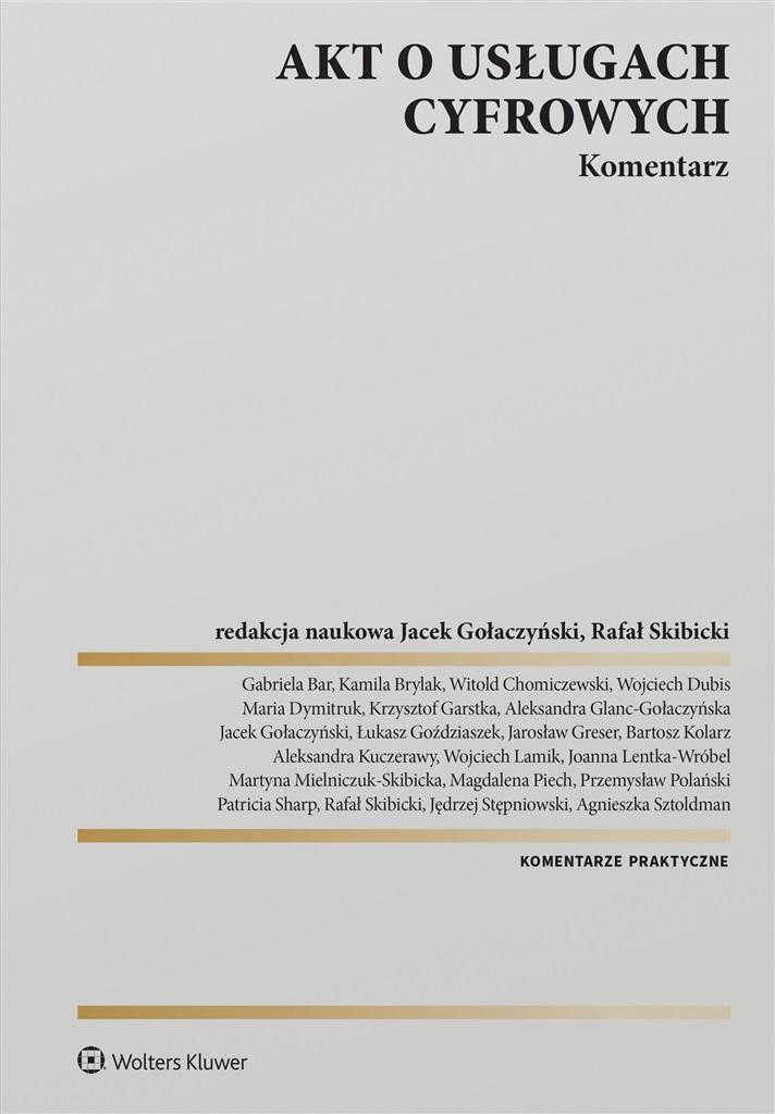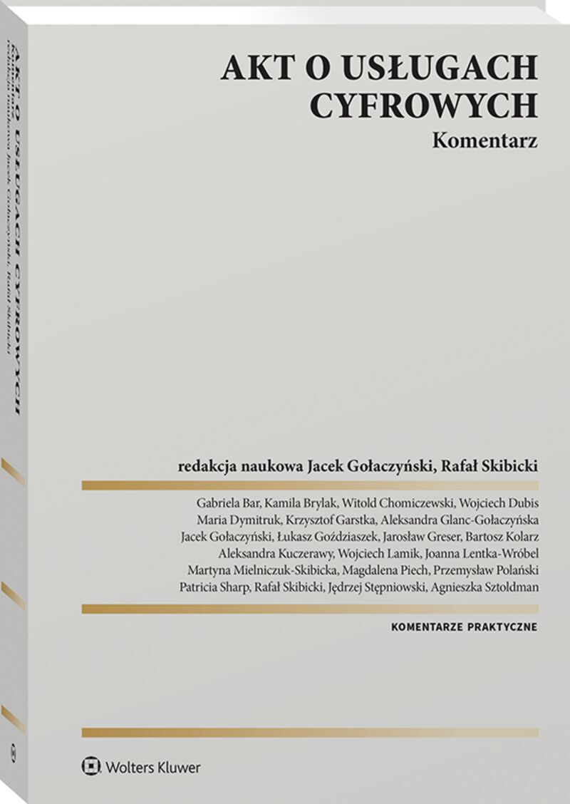 Książka omawia przepisy Aktu o usługach cyfrowych (DSA) od strony praktycznej z uwzględnieniem aktualnego dorobku nauki polskiej i zagranicznej. Przedstawia ona zmiany, jakie wprowadza DSA w stosunku do wcześniejszych regulacji dyrektywy o handlu elektronicznym oraz ustawy o świadczeniu usług drogą elektroniczną. Unikalną wartością komentarza jest także uwzględnienie polskiego projektu ustawy o zmianie ustawy o świadczeniu usług drogą elektroniczną, który ma wdrożyć Akt o usługach cyfrowych do prawa polskiego. Publikacja szczegółowo prezentuje nowe reguluje dotyczące m. in.: obowiązku moderowania nielegalnych treści w Internecie przez platformy typu Facebook, X (dawniej Twitter) czy Google, a także wprowadzania obowiązkowej oceny ryzyka i większej przejrzystości algorytmów, co pomoże w walce ze szkodliwymi treściami i dezinformacją w sieci. Książka przeznaczona jest przede wszystkim dla prawników praktyków, w tym sędziów, adwokatów, radców prawnych, prokuratorów, a także pracowników administracji oraz pracowników naukowych. Będzie ona również pomocna przedsiębiorcom z branż e-commerce, platform internetowych oraz dostawcom usług pośrednich. "Publikacja (...) wychodzi naprzeciw oczekiwaniom środowiska prawniczego oraz IT w związku z wejściem w życie DSA, czyli Aktu o usługach cyfrowych, stanowiącego niejako konstytucję dla Internetu. Lektura obowiązkowa dla specjalistów prawa nowych technologii. Regulacja ta jest odpowiedzią na wyzwania związane z nowoczesnymi platformami internetowymi i zmianami w Internecie, jakie nastąpiły od 2000 roku, to jest od przyjęcia dyrektywy o handlu elektronicznym". Z recenzji prof. Dariusza Szostka