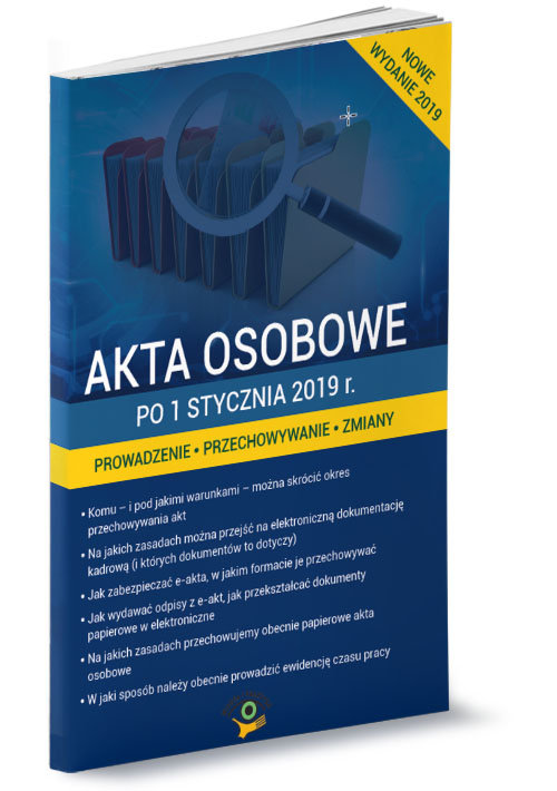 • W jaki sposób „działają” skrócone okresy przechowywania akt osobowych?• Które dokumenty należy przechowywać w poszczególnych częściach akt osobowych lub w dokumentacji związanej z ewidencjonowaniem czasu pracy po 1 styczni 2019 r.?• Co – i w jaki sposób – należy obecnie wykazywać w ewidencji czasu pracy?• Co to znaczy, że dokumentacja związana z ewidencjonowaniem czasu pracy musi być obecnie prowadzona indywidualnie dla każdego pracownika?• Jak stosować sposób numerowania dokumentów w aktach bazujący na podzbiorach?• Jak przejść na e-akta?• Jaka jest procedura?• Jakie warunki musi spełniać elektroniczna dokumentacja?• Czy akta elektroniczne mogą objąć część załogi (albo np. tylko osoby, które już nie pracują)?• Czy można zdigitalizować tylko część dokumentów z akt jednego pracownika?• Jakie są obowiązki informacyjne?Wszystko to i wiele innych kwestii wyjaśniamy w niniejszej publikacji.