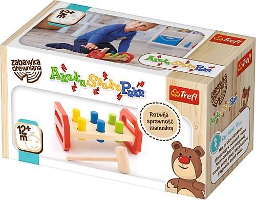 Stabilna deseczka wraz z małym młoteczkiem wykonana z jasnego, naturalnego drewna jest doskonałą zabawką ogólnorozwojową