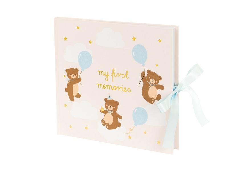 Album na zdjęcia Miś, oprawiony papierem w kolorze beżowym z nadrukiem, zawiązywany na wstążkę, wymiary ok. 28 x 25 cm, 50 kartek, w zestawie z naklejkami