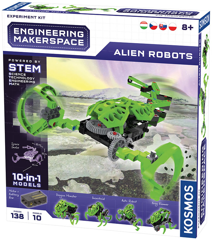 Zbuduj dziesięć kosmicznych maszyn i poznaj zasady dźwigni i przekładni. Silnik zasilany z akumulatora zasila modele. Zbuduj przerażającego stwora z obrotowymi ramionami i przegubowym ogonem. Stwórz robota, który porusza się na sześciu nogach. Stwórz raptora ze skrzydłami poruszanymi w górę i w dół.Wykorzystując mechanizm nożycowy, złóż zwinny pazur chwytakowy. Ponadto, zbuduj modele typu pumpjack, urządzenie wahadłowe, skaczący robot-żabę, wędrującego dino-bota z ramieniem posuwisto-zwrotnym i toczącego się kosmicznego smoka. Wehukuły wyposażone są w silniki elektryczne zasilane bateriami AAA. 28-stronicowa instrukcja poprowadzi Twoją budowę modelu i eksperymenty z ilustrowanymi instrukcjami krok po kroku.