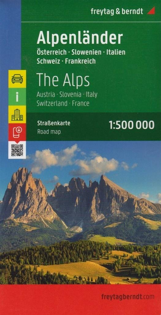 Mapa samochodowa Alp - w skali 1:500 000. Zawiera państwa: Austria, Słowenia, Włochy, Szwajcaria, Francja.