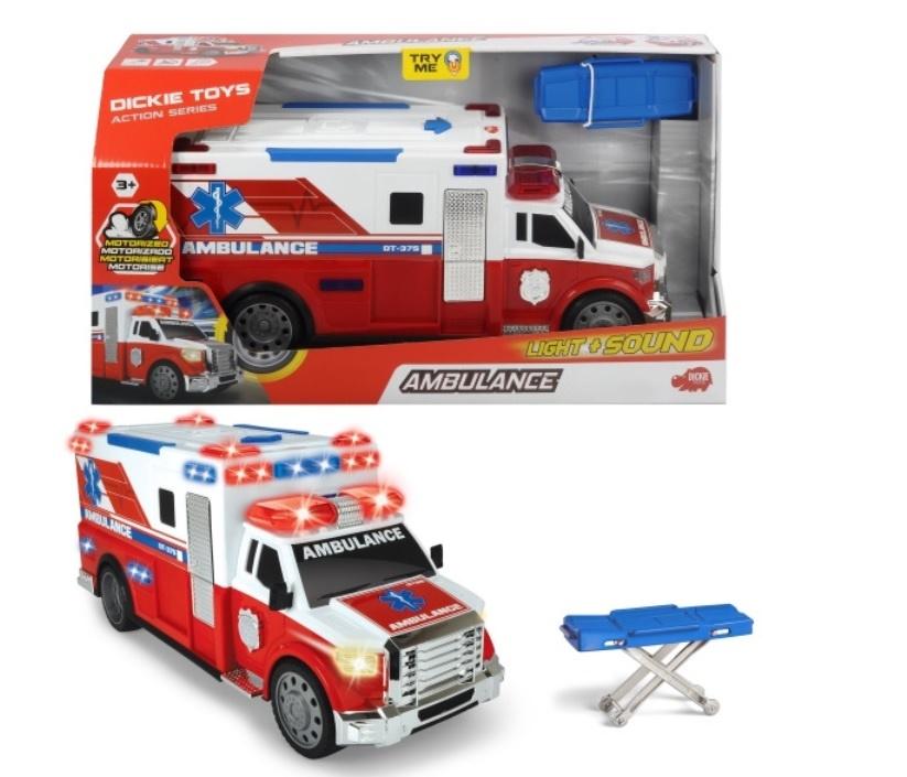 Pojazd Ambulans z automatyczną jazdą do przodu, śwatło i dźwięk, otwierane boczne drzwi, nosze, baterie 2 x 1,5 V R6 w zestawie, 33 cm.