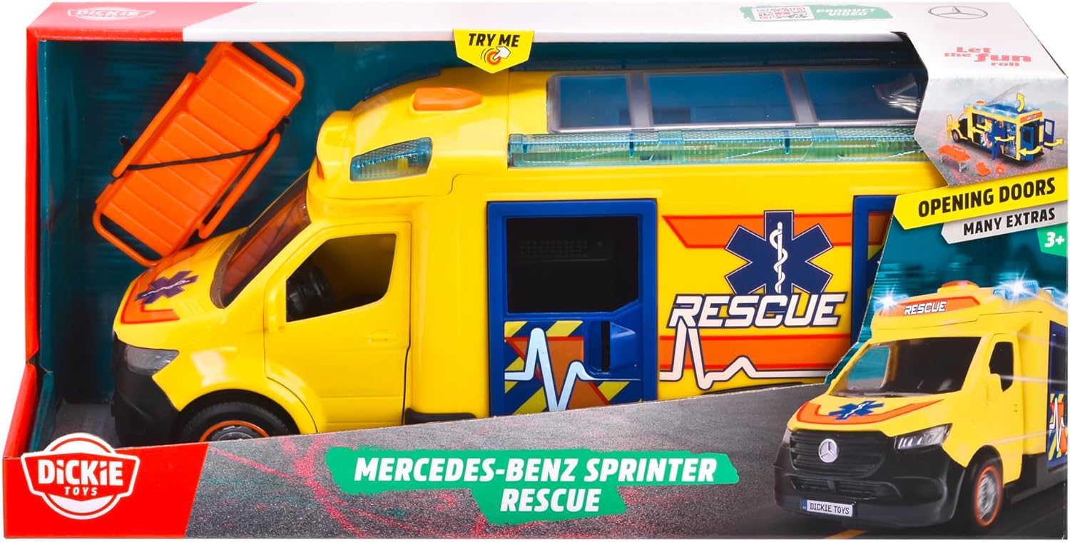 Ambulans na licencji Mercedes z funkcją światła i dźwięku. Pojazd posiada otwierane drzwi kierowcy i pasażera, boczne, tylne oraz przeźroczysty dach. W zestawie nosze, apteczka i plecaczek. Wersja międzynarodowa. Długość 34,5 cm.
