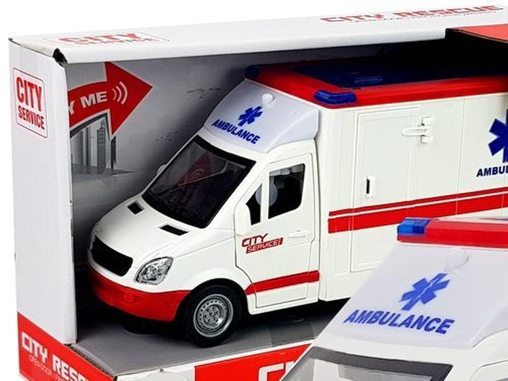 Ambulans Z Napędem Frykcyjnym 1:16 Dźwięk Światła Ambulans medyczny potrzebny jest każdej ekipie ratunkowej. Zapewne znajdzie zastosowanie u małego przyszłego ratownika medycznego i to będą pierwsze kroki w tym zawodzie. Twoje dziecko będzie mogło bawić się godzinami w ratowanie ludzi. Ambulans posiada otwierane drzwi kabiny oraz z tyłu pojazdu, wewnątrz wyposażenie karetki jest idealnie odwzorowane. Od góry posiada niebieska szybkę, przez która można obejrzeć wnętrze pojazdu ratowniczego. Dodatkowo posiada napęd frykcyjny, wystarczy docisnąć do podłoża, pociągnąć do tyłu i puścić. Kolejną zaletą pojazdu są efekty świetlne i dźwiękowe, naciskając na dachu kabiny przycisk, usłyszysz sygnał alarmu, a dzięki kogutom nikt nie przeoczy pojazdu. Wymiary autka: 26 cm x 9 cm x 13 cm Wymiary opakowania: 32 cm x 19 cm x 11,5 cm Zabawka zasilana jest 3 sztukami baterii AG 13, które dołączone są do zestawu. Zapakowana jest w kartonowe pudełko. Ze względu na swój rozmiar przeznaczona jest dla wszystkich dzieciaków powyżej 3. roku życia.