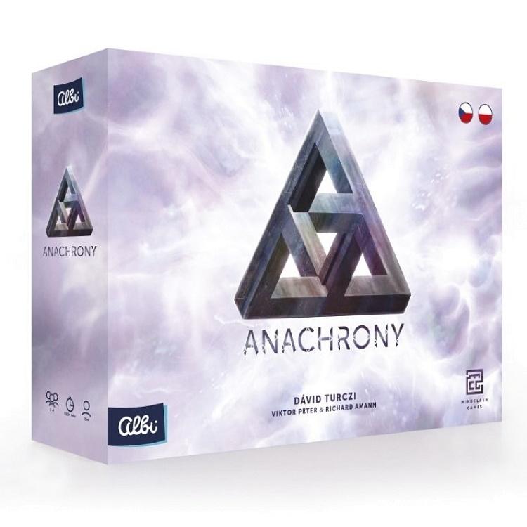 XXVI wiek, Nowa Ziemia. Świat się zmienił. Planeta powoli podnosi się po Dniu Oczyszczenia: dniu, w którym eksplozja nieznanego pochodzenia o katastrofalnym zasięgu wstrząsnęła całą Ziemią. Większość ludności została zgładzona, a znaczna część powierzchni Ziemi przestała nadawać się do zamieszkania. Nikt nie wiedział co tak naprawdę spowodowało apokalipsę - jedyne co mogli zrobić ocaleni, to szukać schronienia i poczekać aż opadnie pył. W Anachrony wcielasz się w lidera jednej ze ścieżek ideologicznych Nowej Ziemi: Harmonii, Dominacji, Postępu lub Zbawienia. Twoim głównym celem jest przygotowanie się na nadchodzące uderzenie asteroidy, zabezpieczenie przyszłości dla swoich ludzi i przezwyciężenie pozostałych trzech Ścieżek, by stać się dominującą ideologią, która ukształtuje przyszłość ludzkości. Rozgrywka toczy się przez maksymalnie siedem rund zwanych erami, które reprezentują kilka lat. Po czwartej erze następuje uderzenie asteroidy, które zmienia to, jak rozgrywane są pozostałe ery i rozpoczyna odliczanie do końca gry. Rozgrywka Anchrony składa się z trzech głównych mechanik: zasilania i używania egzoszkieletów, wykonywania akcji robotnikami, używania podróży w czasie. Dwupoziomowa mechanika zarządzania pracownikami System zarządzania robotnikami w Anachrony obejmuje cztery różne typy pracowników, wyróżniających się między sobą mocnymi i słabymi stronami. Niektóre akcje są domyślnie dostępne dla poszczególnych pracowników, podczas gdy inne są możliwe tylko dzięki specjalnej formie wzmocnienia i ochrony - egzoszkieletowi. Pracownicy i egzoszkielety są zarządzane osobno, lecz do sukcesu potrzebujesz obu. Zarządzanie zasobami w czasie Dzięki szczelinom w czasie łączącym przeszłość z teraźniejszością, liderzy mogą poprosić o użyczenie zasobów od siebie samych z przyszłości. Te dobra mogą znacząco wzmocnić rozwój gracza, jednak nie ma nic za darmo - w późniejszych erach pętla musi zostać zamknięta, a zasoby należy przesłać w przeszłość! Zawartość pudełka: plansza główna 4 plansze graczy 4 dwustronne plansze ścieżki 80 znaczników robotników kostki i żetony zasobów 24 żetony rdzeni zasilających 66 żetonów punktów zwycięstwa 30 znaczników kropli wody 24 sześciokątne znaczniki egzoszkieletów 4 dwustronne karty pomocy 8 kart liderów 4 banery graczy z plastikowymi podstawkami 8 znaczniki podróży w czasie i morale 32 znaczniki ścieżki 36 karfli Warpu 60 kafli budynków 11 kart puli rekrutacji 11 kart puli wydobycia 12 dwustronych kafli osi czasu 1 kafel uderzenia 18 kafli superprojektów 2 kości badań kość paradoksu dwustronny kafel akcji ewakuacji 12 kafli anomalii 45 kafli przełomu 15 kafli upadającej stolicy 9 kafli niedostępnych heksów 8 kart warunków końcowych 16 kart początkowych zasobów 1 notes punktacji 16 żetonów paradoksu plansza "Dzień Sądu" 10 eksperymentów 1. poziomu 10 eksperymentów 2. poziomu 1 karta warunku końcowego 2 kości trajektorii 1 żeton "Ocelenie Ziemi" 1 żeton "Przypieczętowanie Losu" plansza chronobota baner chronobota 6 znaczników egzoszkieletów w kształcie heksów 8 kafli Warpu Chronobota 6 żetonów Chronobota kość Chronobota Liczba graczy: 1 - 4 osoby Wiek: od 15 lat Czas gry: ok. 30 - 120 minut