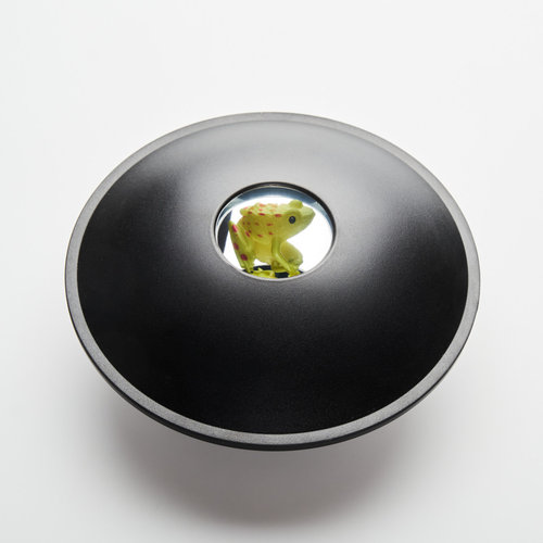 Analogowy projektor hologramów 3D ! Hologram na twoim biurku Czarny owalny kształt z małym okrągłym otworem na górze. Nad tym otworem możesz zobaczyć małą żółtą żabkę, tak realną, że chciałbyś ją złapać. Ale nie umiesz jej nawet dotknąć! Nie dlatego, że żaba ucieka, ale dlatego, że jej tam nie ma. Łapiesz powietrze ! Idealna iluzja 3D Dopiero po dokładnym przyjrzeniu się można zauważyć, że prawdziwa żabka znajduje się wewnątrz owalnego projektora, który składa się z dwóch lustrzanych powłok, które dzięki swojej budowie wysyłają obraz ukrytych wewnątrz przedmiotów ponad powierzchnię projektora tworząc pozornie prawdziwy obraz 3D Oczywiście dołączoną małą żabkę możesz zastąpić innymi przedmiotami, np. kwiatkiem, orzechem, miniaturową zabawką monetą, czy kilkoma kroplami wody. W załączonej instrukcji znajdziesz szczegółowe wyjaśnienie zjawiska.