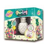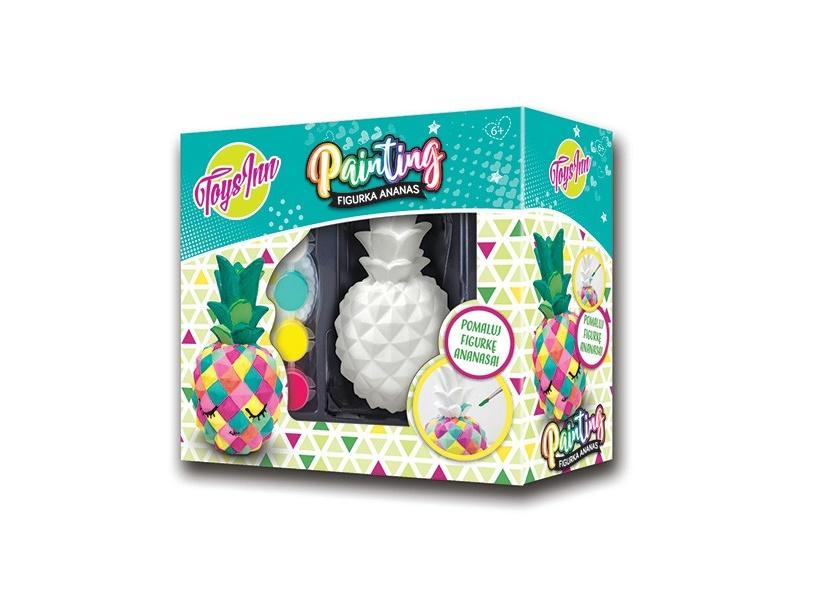 Zestaw zawiera figurkę ananasa do malowania, 5 farbek, pędzelek i dwie tacki do mieszania farb. Produkt przeznaczony dla dzieci w wieku 6+.