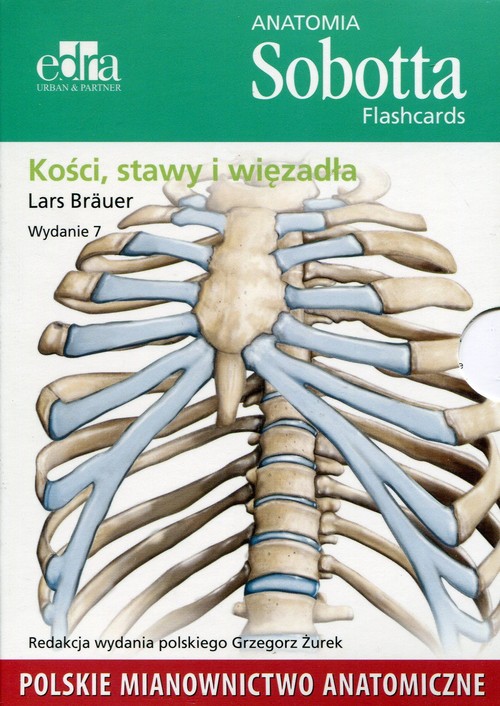 Anatomia Sobotta Flashcards – Twój przenośny sposób na anatomię Anatomia Sobotta Flashcards to kolorowe ilustracje struktur anatomicznych połączone z szczegółowym opisem i zwięzłym omówieniem tych struktur oraz ich korelacji klinicznych i funkcjonalnych. To doskonała pomoc naukowa i uzupełnienie Atlasu anatomii człowieka Sobotty Dzięki flashcards: • ZAPAMIĘTASZ WIĘCEJ, UCZĄC SIĘ MNIEJ • możesz się uczyć w dowolnym miejscu • stwierdzisz, że anatomia jest możliwa do opanowania • możesz przepytać sam siebie, bez proszenia innych JAK TO DZIAŁA? Na jednej stronie karty znajduje się opisana mianami struktura anatomiczna, z drugiej strony brak opisów umożliwia sprawdzenie nabytej wiedzy. Przykładowe pytanie na każdej karcie ułatwi przygotowanie się do egzaminu. Odpowiedź znajduje się na odwrocie karty. Ramki i tabele zawierają zwięzłe informacje na temat zależności klinicznych, anatomicznych i funkcjonalnych. Miana anatomiczne są zgodne z aktualnym Terminologia Anatomica.