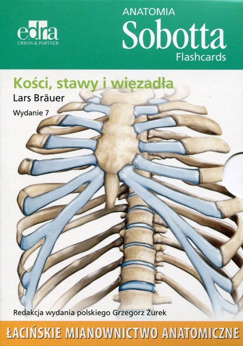 Anatomia Sobotta Flashcards – Twój przenośny sposób na anatomię Anatomia Sobotta Flashcards to kolorowe ilustracje struktur anatomicznych połączone z szczegółowym opisem i zwięzłym omówieniem tych struktur oraz ich korelacji klinicznych i funkcjonalnych. To doskonała pomoc naukowa i uzupełnienie Atlasu anatomii człowieka Sobotty Dzięki flashcards: • ZAPAMIĘTASZ WIĘCEJ, UCZĄC SIĘ MNIEJ • możesz się uczyć w dowolnym miejscu • stwierdzisz, że anatomia jest możliwa do opanowania • możesz przepytać sam siebie, bez proszenia innych JAK TO DZIAŁA? Na jednej stronie karty znajduje się opisana mianami struktura anatomiczna, z drugiej strony brak opisów umożliwia sprawdzenie nabytej wiedzy. Przykładowe pytanie na każdej karcie ułatwi przygotowanie się do egzaminu. Odpowiedź znajduje się na odwrocie karty. Ramki i tabele zawierają zwięzłe informacje na temat zależności klinicznych, anatomicznych i funkcjonalnych. Miana anatomiczne są zgodne z aktualnym Terminologia Anatomica.