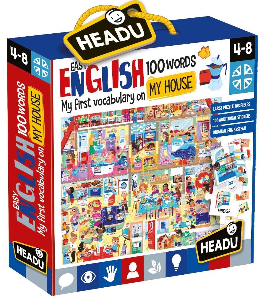 Graj i ucz się naraz dzięki skutecznej metodzie. Ten zestaw, wykonany z wytrzymałych materiałów, zawiera ponad 100 naklejek i gigantyczną układankę ze specjalnymi żetonami do nauki wielu słów związanych z domem i codziennym życiem. Dzięki dedykowanej aplikacji dziecko pozna też prawidłową wymowę. W zestawie: 108 dwustronnych puzzli, 108 naklejek. Wiek: 4-8. Wymiary układanki po ułożeniu: 60 x 43 cm.