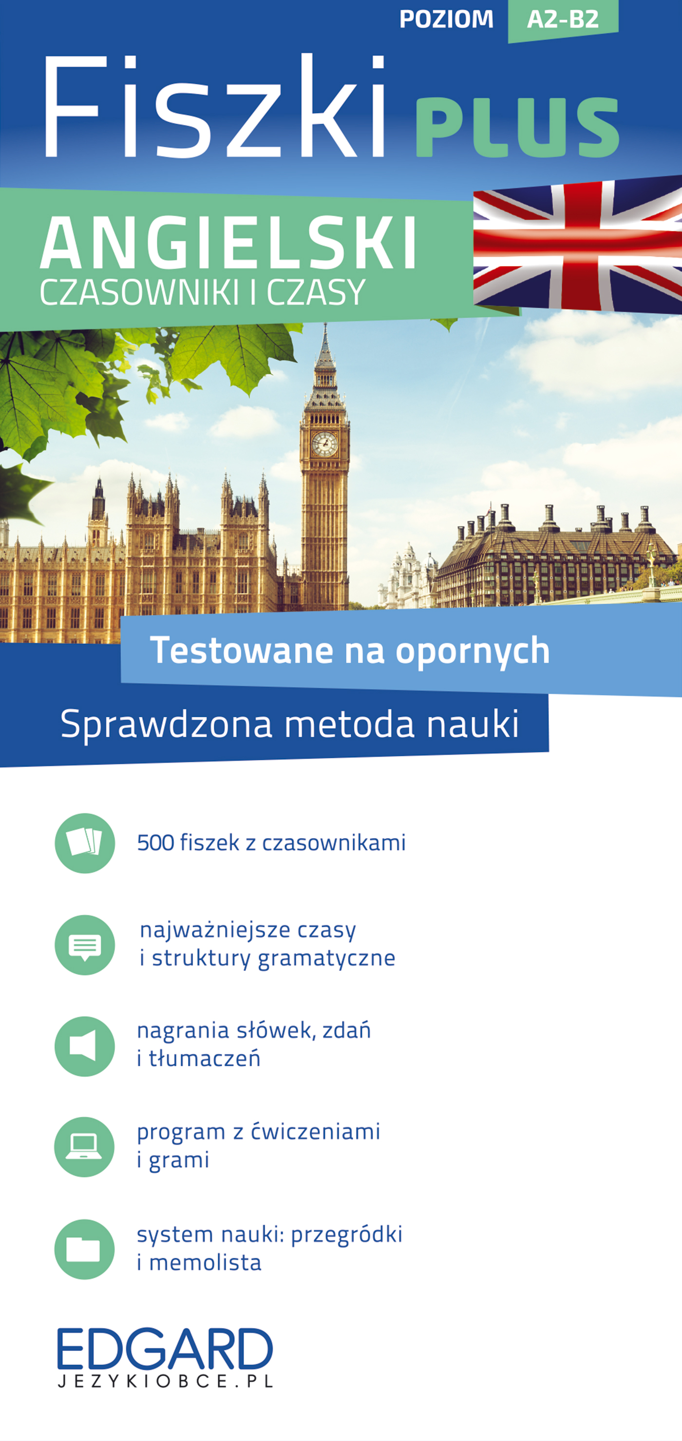 Fiszki PLUS. Angielski Czasowniki i czasy  to zestaw 500 fiszek z czasownikami w najważniejszych strukturach  gramatycznych na poziomie początkującym oraz średniozaawansowanym  (A2-B2). Specjalny system nauki z wykorzystaniem kolorowych przegródek  pozwoli zaplanować systematyczną naukę oraz obserwować efekty, a także