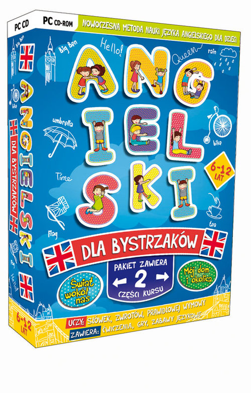 Angielski Dla Bystrzaków Seria programów komputerowych uczących podstaw języka angielskiego. To programy oparte na nowoczesnej i wyjątkowo skutecznej metodzie nauki języka angielskiego. Polecane szczególnie dzieciom w wieku przedszkolnym i uczniom młodszych klas szkół podstawowych. Każdy z programów zawiera szereg gier i zabaw językowych za pomocą których dzieci łatwo i szybko poznają nowe słówka, zwroty i ich prawidłową wymowę. Słownictwo zawarte w programach zostało dobrane tak, by obejmować podstawowe słówka i zwroty od których należy rozpoczynać naukę języka angielskiego. Zakres obejmuje, liczby, kolory, członków rodziny, kształty, pożywienie, zwierzęta, rzeczy, otoczenie, ubiory, części ciała, urządzenia itp. Dodatkowo poszczególne programy zawierają multimedialny słowniczek, dzięki któremu dziecko może poznać znaczenie wielu wyrazów i nauczyć się prawidłowej wymowy. W skład pakietu Angielski Dla Bystrzaków wchodzą dwie części: - Mój dom i okolica - Świat wokół nas Angielski Dla Bystrzaków to najlepszy sposób rozpoczęcia przygody z językiem angielskim! - Zawiera gry i zabawy językowe! - Uczy słownictwa i prawidłowej wymowy! - Łączy naukę z przyjemnością zabawy z komputerem! Wymagania sprzętowe: PC z procesorem 1 GHz, Windows XP/Vista/7/8/10